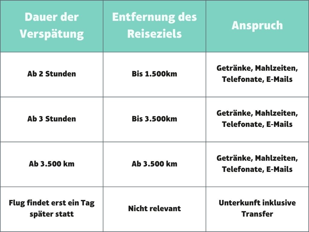 - Welche Leistungen beinhaltet sind, hängt von der Dauer der Verspätung sowie der Flugdistanz