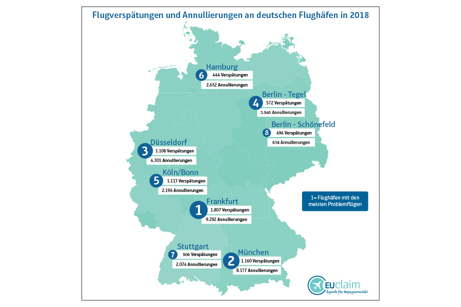 Rund 30-mal am Tag hieß es am Flughafen Frankfurt am Main: Flug gestrichen oder Flug verspätet sich. Mehr als 11.000 Flüge wurden 2018 am größten deutschen Airport annulliert oder landeten mit großer Verspätung. Rang zwei nimmt der Flughafen München ein. Hier zählt die EUclaim-Datenbank 9.337 Ausfälle und Verspätungen. Der Flughafen mit den drittmeisten Problemen ist Düsseldorf. Übrigens sind diese drei Flughäfen auch die größten in Deutschland. Und wer von Düsseldorf nach München fliegen musste, hatte es besonders schwer, pünktlich anzukommen. 323 Flugausfälle allein auf dieser Route sind trauriger Spitzenwert.