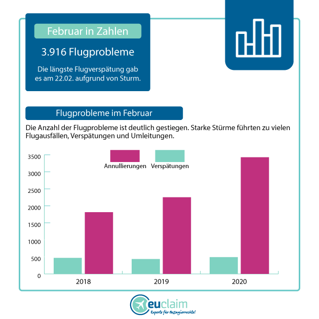 Abgedeckte Dächer und umgeknickte Bäume. In der ersten Monatshälfte sorgte das Orkantief „Sabine“ für reichlich Chaos – auch im Luftverkehr. Allein am 10. Februar mussten wegen des Sturms 1.553 Flüge gestrichen werden oder sie landeten erst mit mehrstündiger Verspätung. Auch für den 9. Februar listet die Flugdatenbank von EUclaim 734 Flugausfälle und Verspätungen auf.