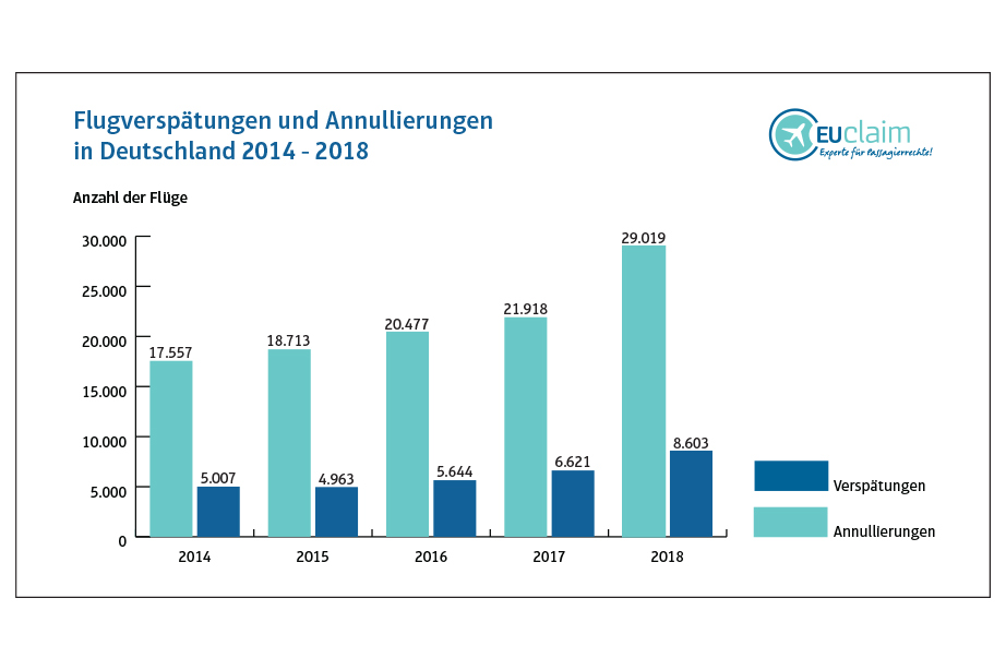 Besonders hart traf es Passagiere im Sommer 2018: Allein zwischen April und Oktober wurden 21.280 Flüge von und nach Deutschland gestrichen, 6.369 Maschinen kamen mehr als drei Stunden verspätet an ihrem Zielort an. Im Vergleichszeitraum 2017 fielen 12.565 Flüge aus, 4.413 waren deutlich verspätet. „Das sind 60 Prozent mehr Problemflüge als im Vorjahressommer. Seit Jahren kämpfen Airlines im Sommerflugplan mit Problemen, doch 2018 bildet den bisherigen Negativ-Rekord“, sagt Tim Lamyon, Chef von EUclaim Deutschland.
